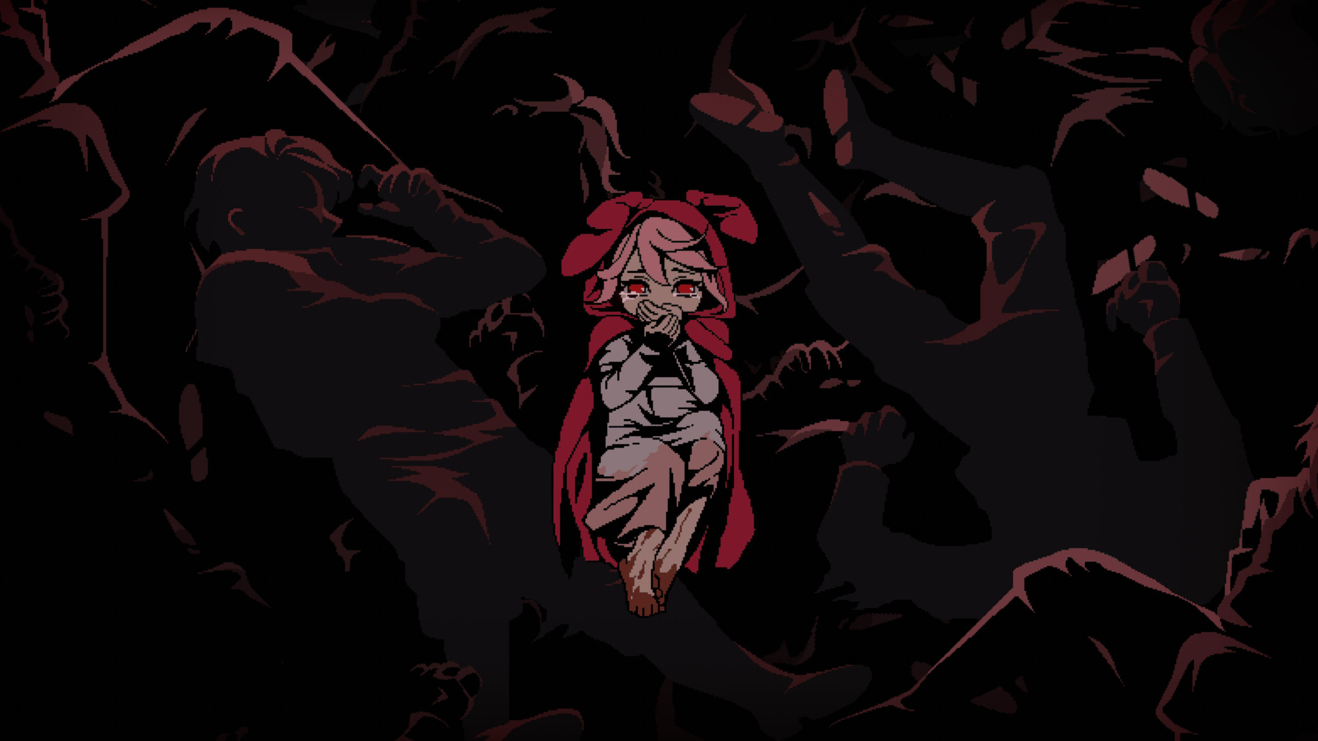 Aunque Rubinite parece encantador a simple vista, su estética pixel art esconde un mundo lleno de decapitaciones, ejecuciones y sangre, contrastando fuertemente con los momentos más tiernos. Ruby lleva una capucha con orejas de conejo… y un cuchillo de cocina ensangrentado en mano.